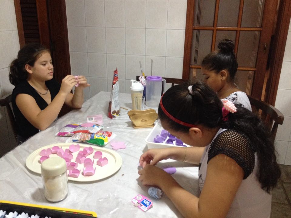 Também fizeram aniversário Vivian e Brenda. As crianças ajudam preparar docinhos e a festinha.